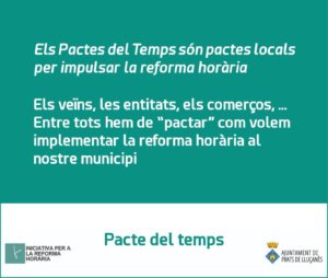 El passat mes de juny es va presentar el projecte Pacte del Temps a Prats de Lluçanès, un acord en l’àmbit local per a impulsar la Reforma Horària al municipi, en el que hi participen diferents taules sectorials (comerç i consum, educació, mobilitat…) que consensuen les mesures a adoptar per tal d’implamentar la reforma horària en la qual tothom en surti beneficiat.