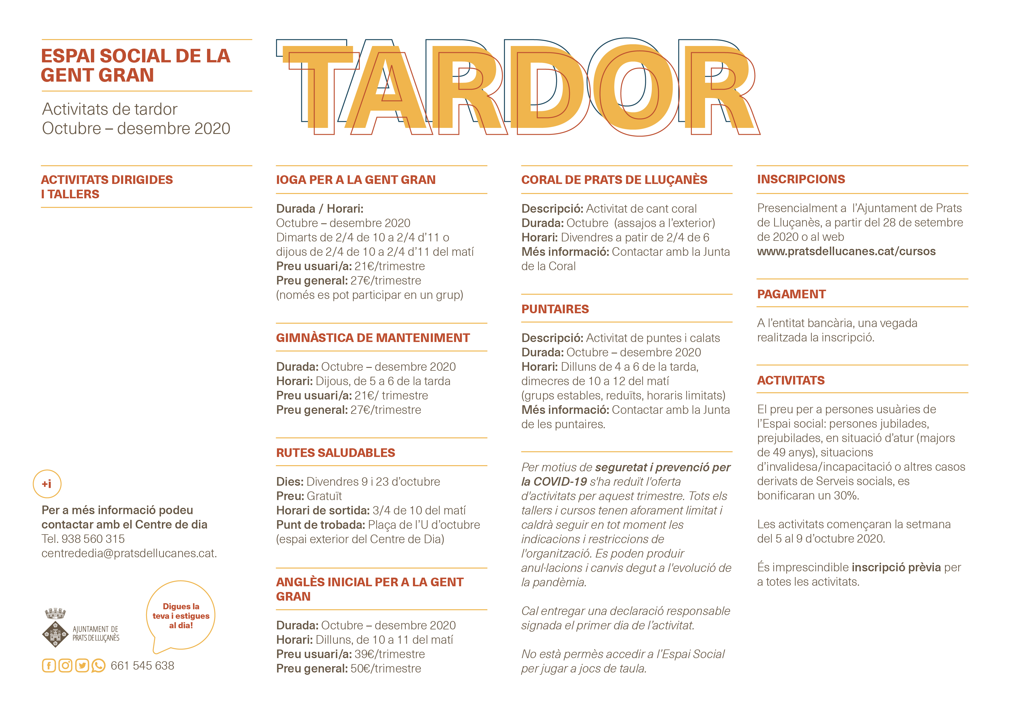 Caldrà seguir en tot moment les indicacions de l’organització, així com les mesures de prevenció vigents. El primer dia de l’activitat caldrà entregar una declaració responsable signada per la persona participant. No està permès accedir a l’Espai Social per jugar a jocs de taula.