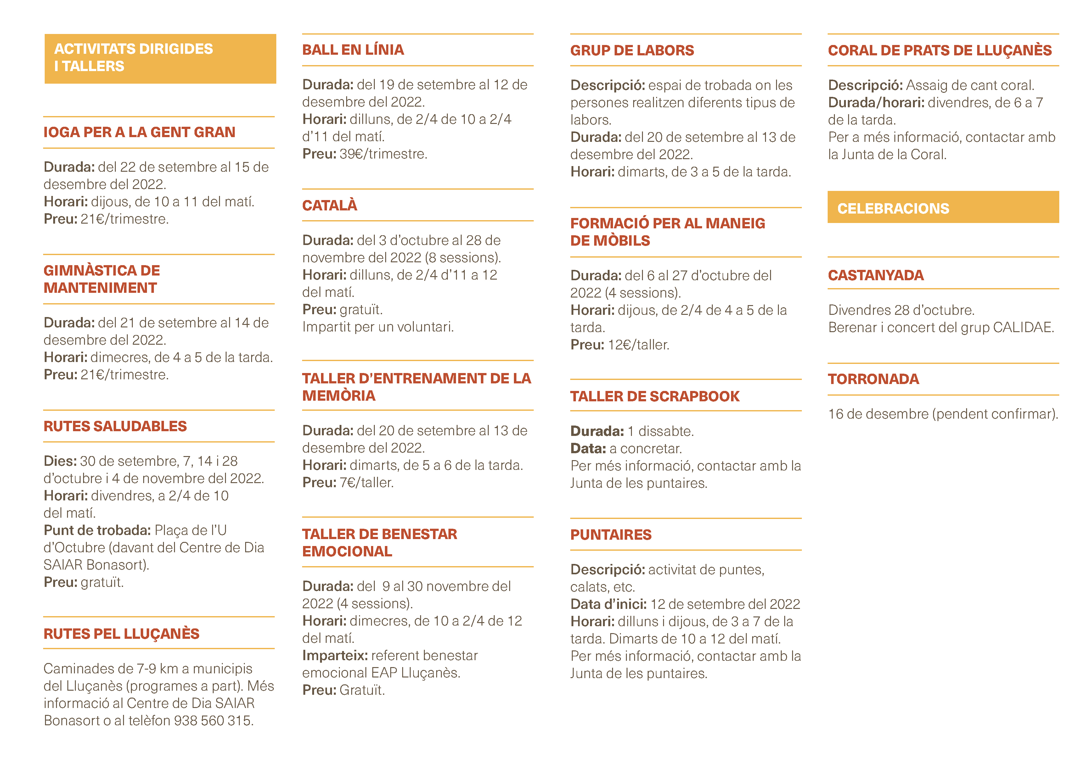 Entre els tallers en trobem de destinats a la salut, altres vinculats als hàbits socials, a la música, o les labors. D’altra banda, per aquells que tinguin inquietuds formatives també s’imparteix un curs de català per a la gent gran.