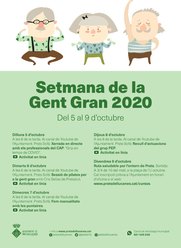 Prats celebrarà la segona edició de la Setmana de la Gent Gran amb diverses activitats repartides entre el dilluns 5 d’octubre i divendres dia 9. Tal i com exposa la regidora d’Acció Social, Montserrat Juvanteny, enguany, a causa de la situació actual la major part dels actes seran telemàtics a través de la iniciativa Prats Sofà i es podran veure a través del canal de Youtube de l’Ajuntament.