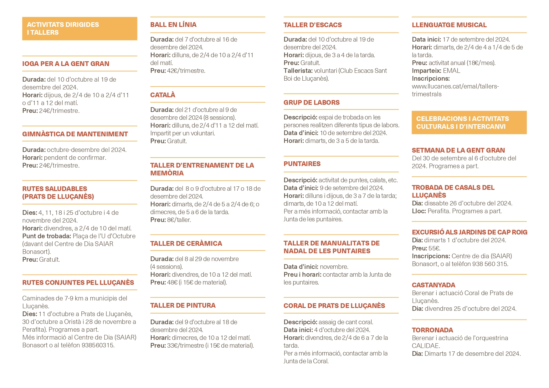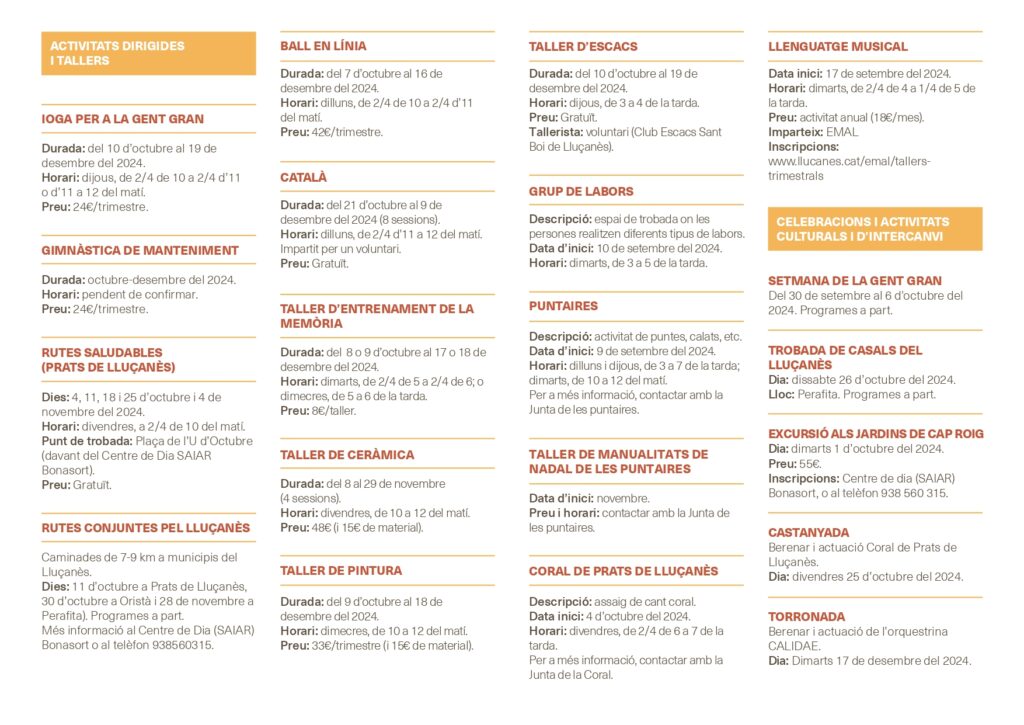 Les activitats tindran lloc a partir del 17 de setembre i fins el proper mes de desembre, i és imprescindible la inscripció prèvia ja que tots els cursos tenen aforament limitat.