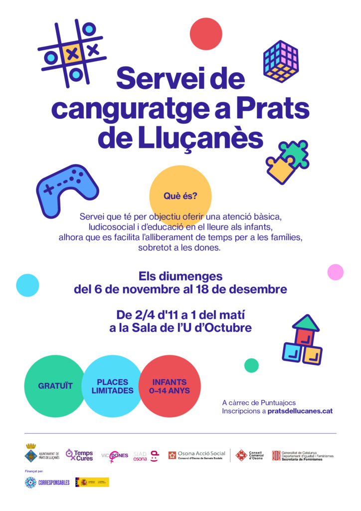 Aquest servei es desplega gràcies al suport del Consorci d’Osona de Serveis Socials, concretament de l’Oficina Tècnica d’Igualtat de Gènere i LGTBI, a través del programa Temps x Cures, finançat pel Departament d’Igualtat i Feminisme de la Generalitat de Catalunya, dins el Pla Corresponsables (2021-2023), el qual és una nova política pública creada per la Secretaria d’Estat d’Igualtat i per la Violència de Gènere, del ministeri d’Igualtat.