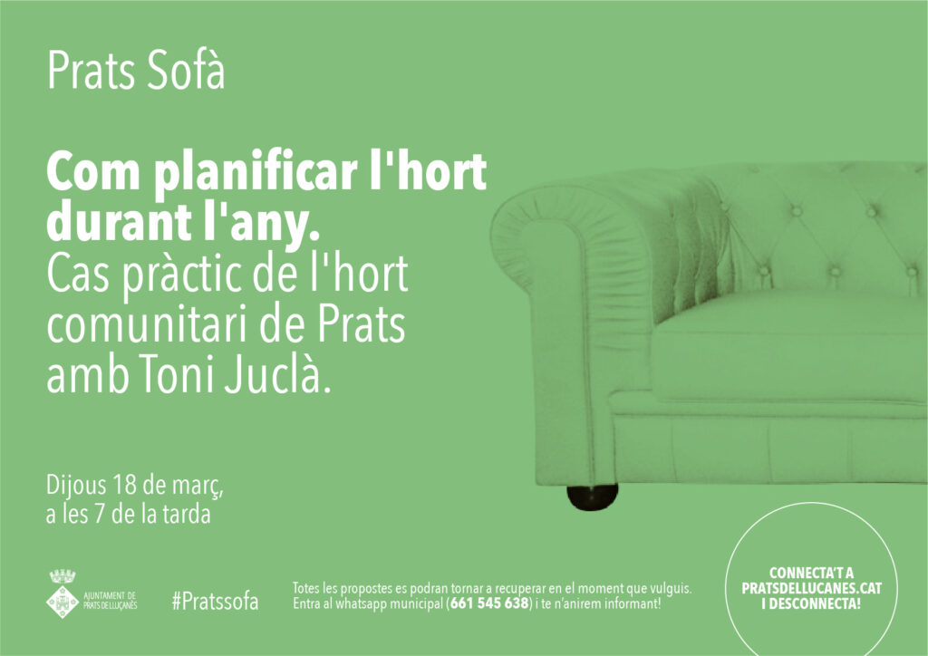 Dijous 18 de març, a les 7 de la tarda s’emetrà un Prats Sofà, al canal de Youtube sobre com planificar l’hort durant l’any. A més, s’explicarà i es donarà a conèixer el projecte de l’hort comunitari de Prats amb els seus participants i el coordinador del projecte, Toni Juclà.
