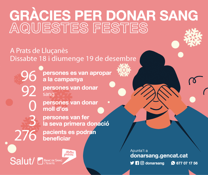 Aquest cap de setmana, a la darrera campanya de donació de sang de l’any a Prats hi van participar un total de 96 persones. Hi van haver 4 oferiments i 3 persones van ser donants per primera vegada. 276 pacients es podran beneficiar de les donacions de Prats.