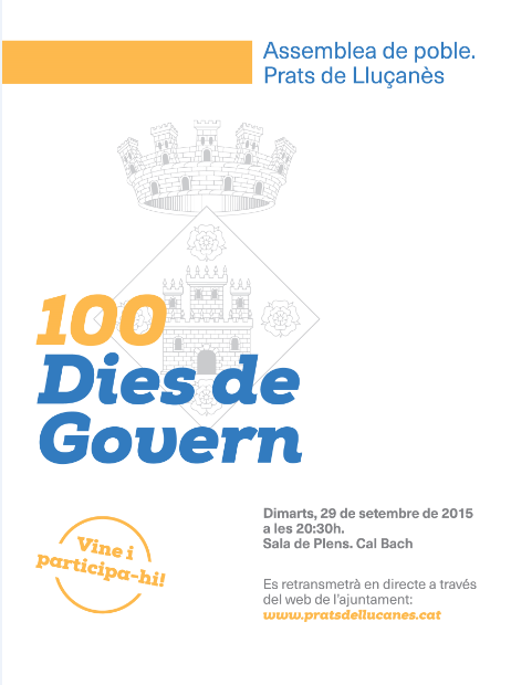 Fa 100 dies que Prats de Lluçanès té nou govern a l’Ajuntament. Per aquest motiu, l’Equip de Govern convoca a una ASSEMBLEA DE POBLE, el proper dimarts 29 de setembre a 2/4 de 9 del vespre, a la Sala de Plens de Cal Bach.