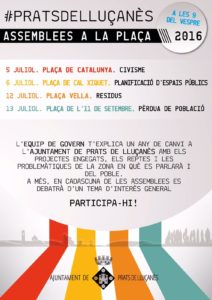 Així, el 5 de juliol a la plaça de Catalunya es parlarà de civisme; el 6 de juliol a la plaça de Cal Xiquet s’abordarà la planificació d’espais públics; els residus seran el tema general que es tractarà a la plaça Vella el 12 de juliol, i el 13 de juliol, a la plaça de l’11 de setembre, es parlarà sobre la pèrdua de població. Totes les assemblees començaran a les 9 del vespre.