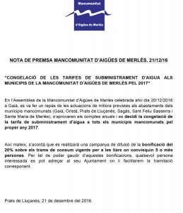 En l’Assemblea de la Mancomunitat d’Aigües de Merlès celebrada ahir dia 20/12/2016 a Gaià, es va fer un repàs de les actuacions de millora previstes als abastaments dels municipis mancomunats, entre els quals hi ha Prats de Lluçanès.