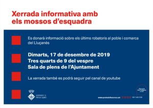 La Sala de plens de l’Ajuntament de Prats de Lluçanès acollirà demà, dimarts 17 de desembre, una xerrada informativa per parts dels Mossos d’Esquadra sobre els últims robatoris al poble i a la comarca del Lluçanès.
