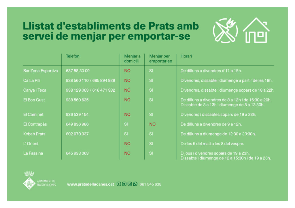 Si ets un establiment que ofereix aquests serveis i no figura en el llistat, ens ho podeu fer saber al whatsapp municipal 661 545 638.