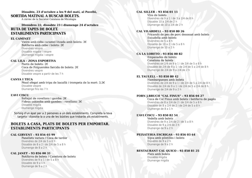 El bolet posat al plat serà el gran protagonista d’aquesta edició amb la ruta de tapes del bolet que es podran degustar els dies 22, 23 i 24 d’octubre als següents establiments del poble: l’Avi Ciscu, Cal Caminet, Canya i Teca i Cal Lila – zona esportiva.