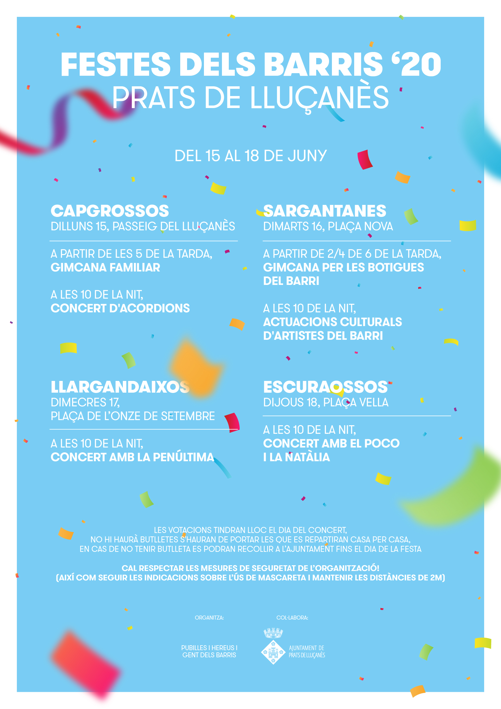 Les votacions de la pubilla i hereu de cada barri tindran lloc el dia del concert. Aquest any, com a mesura de prevenció, no hi haurà butlletes al lloc de la votació. Prèviament es repartiran les butlletes casa per casa i el dia de la festa, s’hauran de portar per poder votar a la pubilla i l’hereu del barri. En cas de no tenir butlleta també es podran recollir a l’Ajuntament fins el dia de la festa.
