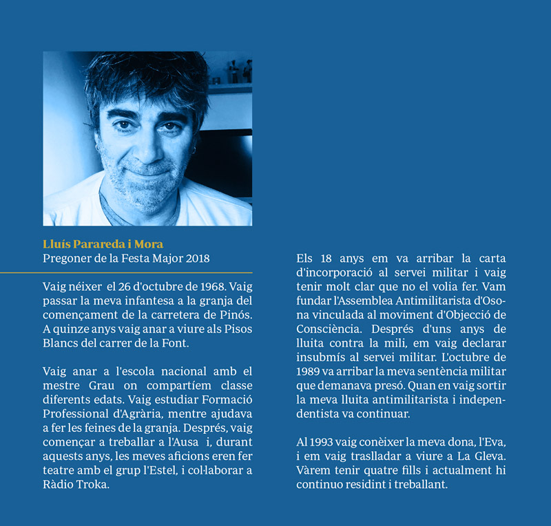 L’alcalde, Isaac Peraire, explica que “aquest any hem volgut contribuir a no normalitzar la situació que viu el nostre país, i lligar el Pregó també amb la història recent del nostre poble. Així, el pregó anirà a càrrec del pradenc Lluís Parareda, que va estar empresonat per motius polítics.”
