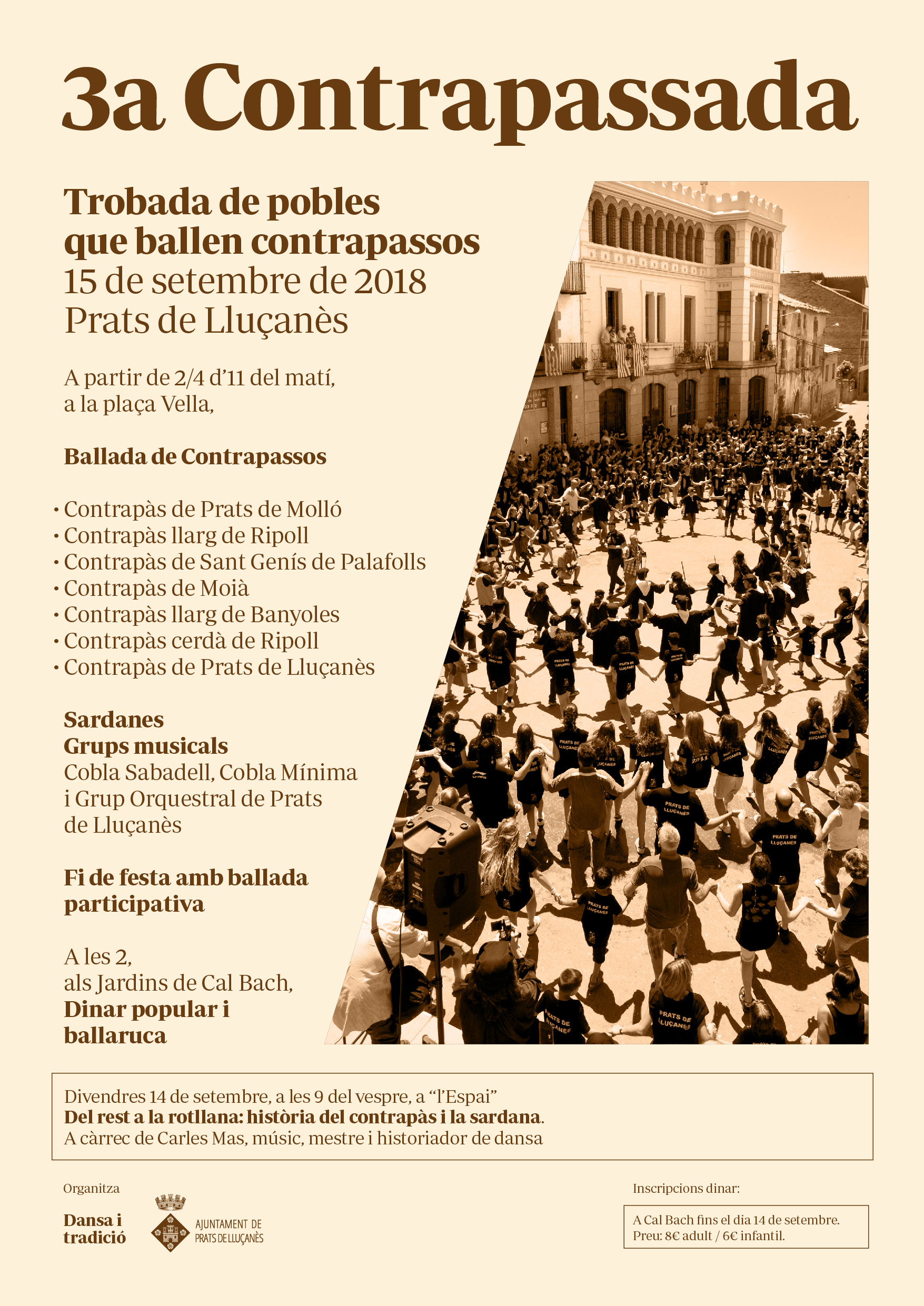 Per aquest motiu, a banda de la ballada, el divendres 14 de setembre es farà una xerrada sobre l’expansió i decadència del ball, amb les possibles circumstàncies que el van arraconar i la seva progressiva substitució, en alguns indrets, per la sardana. La conferència “Del rest a la rotllana: història del contrapàs i la sardana” a càrrec del músic i expert en contrapassos, Carles Mas es farà a “l’Espai” a les 9 del vespre.