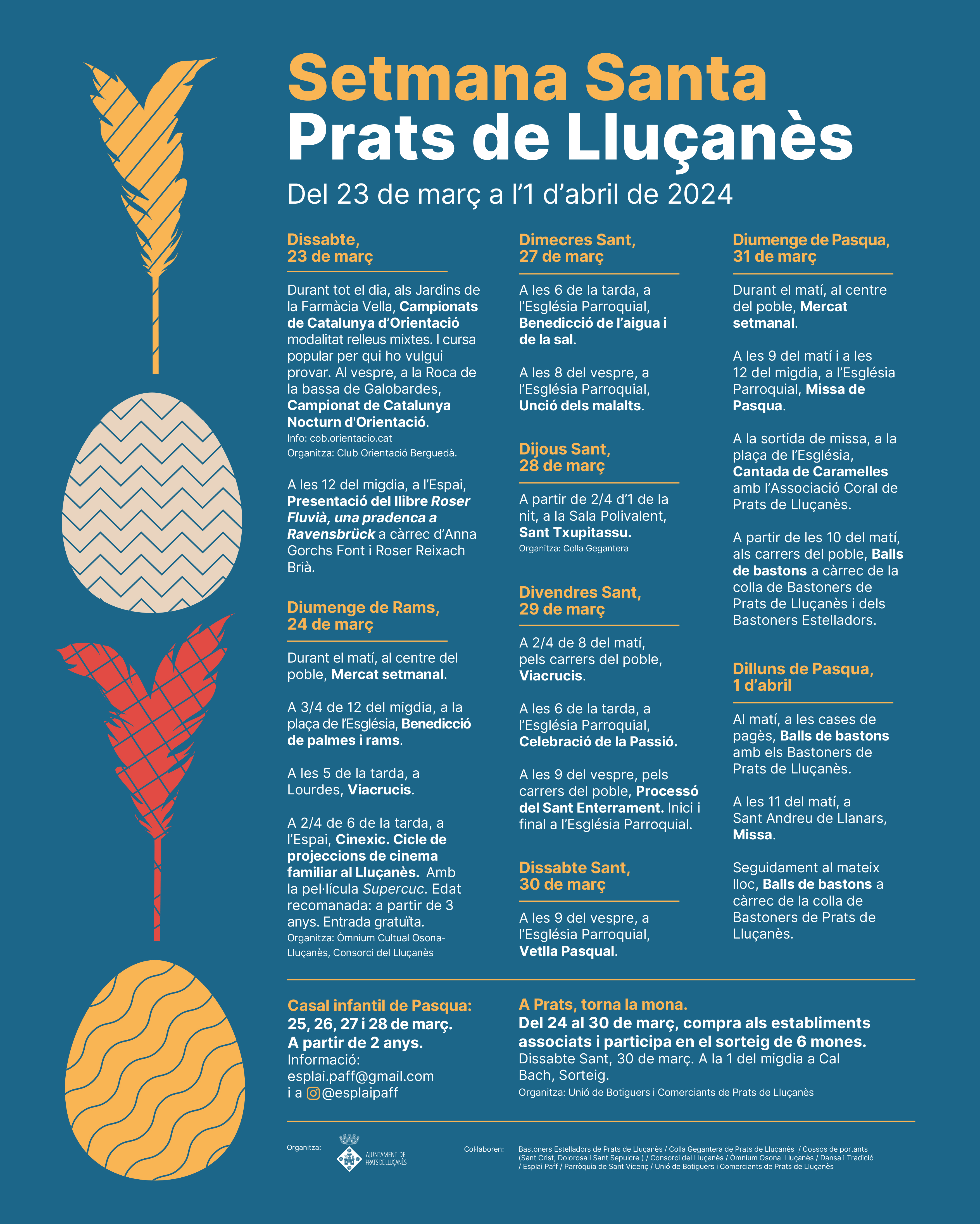Prats de Lluçanès celebra la Setmana Santa amb una vintena de propostes per a totes les edats, entre el 23 de març i l’1 d’abril. L’Ajuntament, de la mà de diverses entitats del poble, presenta una setmana plena de celebracions que impliquen directament un component religiós, amb un rerefons de costum i tradició cultural arrelat amb força al poble. Podeu consultar tota la programació AQUÍ.