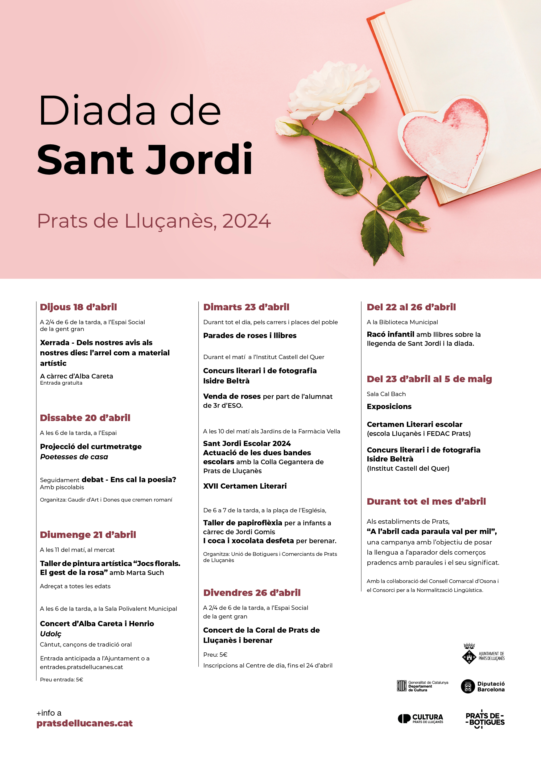 Prats de Lluçanès celebra la diada de Sant Jordi 2024 amb una àmplia proposta d’activitats culturals i tradicionals, durant la segona quinzena del mes d’abril. Els actes s’han organitzat des de l’àrea de Cultura i Festes de l’Ajuntament de Prats de Lluçanès, de la mà dels centres educatius i de diverses entitats del municipi.