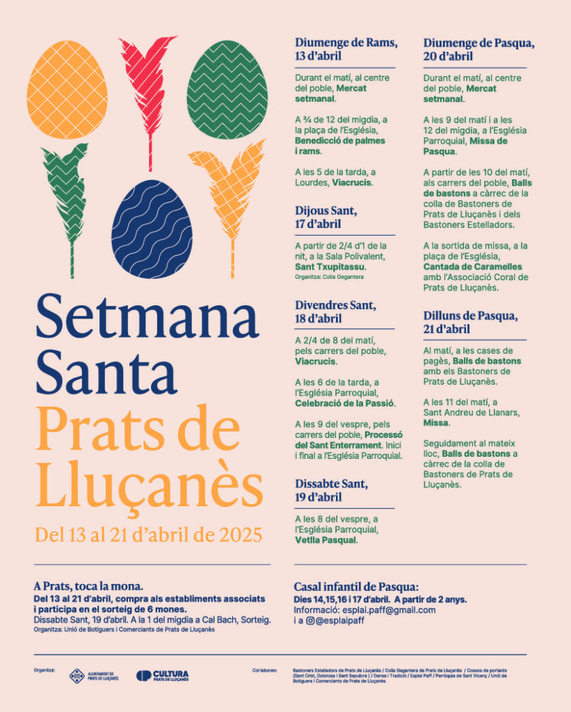 Del 13 al 21 d’abril de 2025, Prats de Lluçanès celebrarà la Setmana Santa amb un assortit important de propostes culturals i festives per a totes les edats. L’Ajuntament, amb el suport i la col·laboració de les diverses entitats del poble, presenta una programació que combina els tradicionals actes religiosos, les activitats culturals tan arrelades al poble i diferents propostes festives per tots els gustos. Podeu consultar tota la programació AQUÍ.