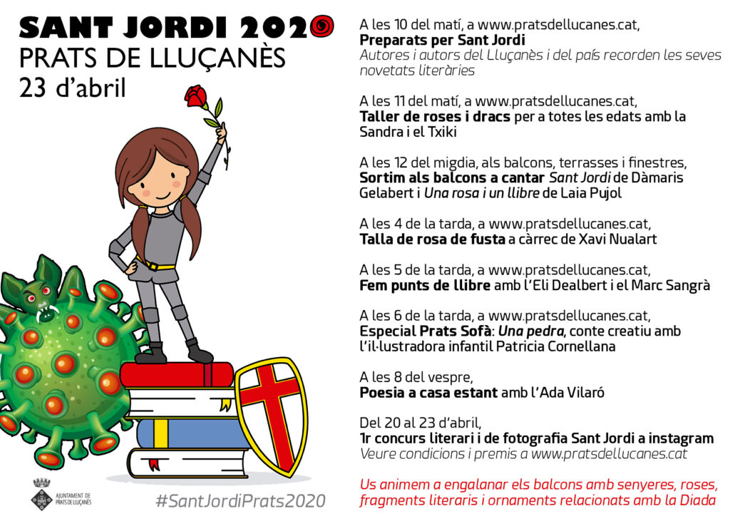 Aquest serà un Sant Jordi especial i singular. La situació actual no permet celebrar una diada convencional a la recerca de llibres i roses per a les persones estimades. Per aquest motiu l’Ajuntament de Prats anima als pradencs i pradenques perquè aquest 23 d’abril se sumin a la iniciativa de celebrar Sant Jordi des de casa, a través d’un conjunt d’activitats que es podran seguir des del web municipal i des del canal youtube, com ja es fa des de l’inici del confinament amb la iniciativa Prats Sofà.