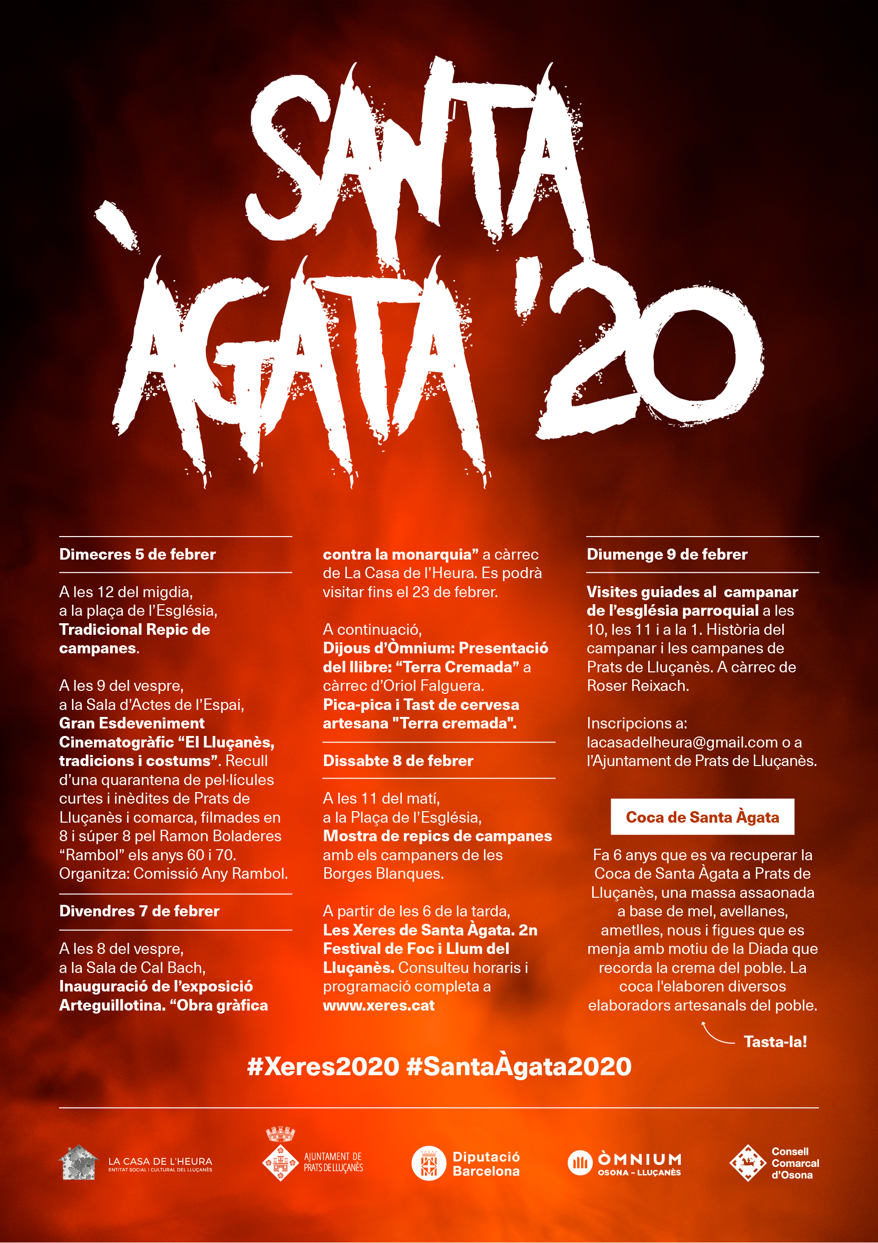 Prats commemorarà un any més Santa Àgata amb diversos actes culturals del 5 al 9 de febrer i la celebració de les Xeres de Santa Àgata, el 2n Festival de Foc i Llum del Lluçanès per rememorar el 5 de febrer de 1714, dia de Santa Àgata, quan les tropes de Felip V van cremar per primera vegada el municipi de Prats de Lluçanès, i van provocar grans pèrdues i la fugida de moltes de les famílies que hi habitaven. Podeu consultar tots els actes previstos aquí.