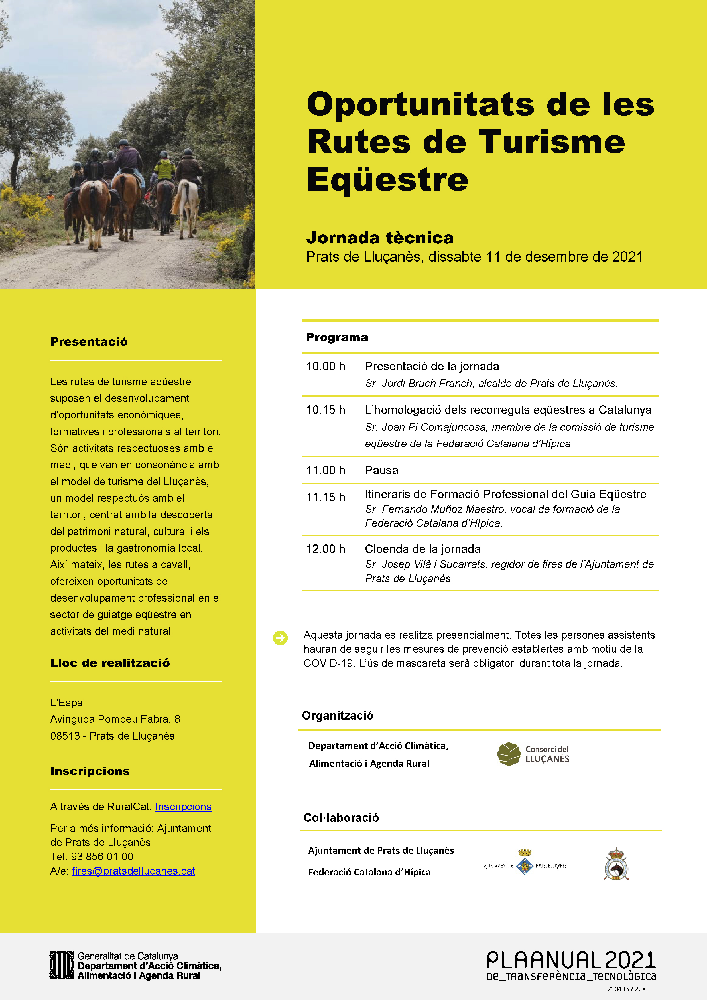 Un any més, la mostra està tematitzada entorn el món del cavall. En aquesta línia, dissabte 10 de desembre se celebrarà la Jornada tècnica ‘Oportunitats de les Rutes de Turisme Eqüestre’. Ponències: l’homologació dels recorreguts eqüestres a Catalunya i actualitat de la formació al sector eqüestre. Es comptarà amb les intervencions de Joan Pi i Fernando Muñoz, membres de la Federació Catalana d’Hípica. Podeu consultar el programa en aquest enllaç. Cal inscripció prèvia gratuïta al correu fires@historic.pratsdellucanes.cat o al 938560100.