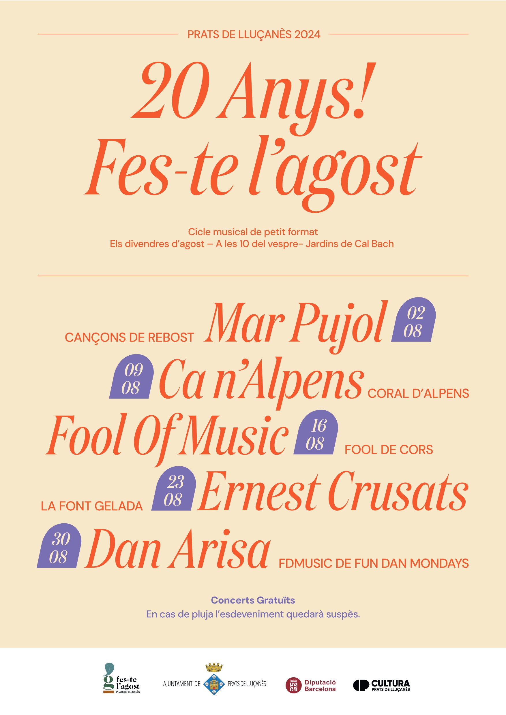 Aquest 2024, Prats de Lluçanès celebra els 20 anys del cicle musical de petit format “Fes-te l’agost” amb una programació que portarà cinc propostes artístiques, cada divendres del mes d’agost, a les 10 del vespre, als Jardins de Cal Bach.