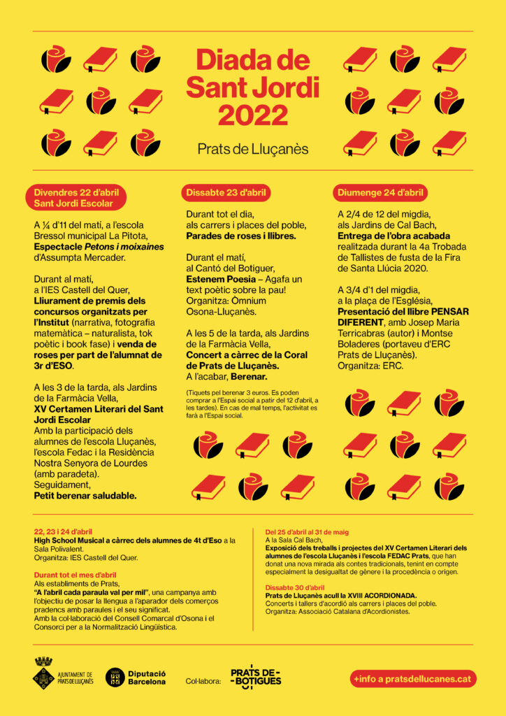 A les 3 de la tarda, als Jardins de la Farmàcia Vella, XV Certamen Literari del Sant Jordi Escolar. Amb la participació dels alumnes de l’escola Lluçanès i l’escola Fedac Seguidament, petit berenar saludable.