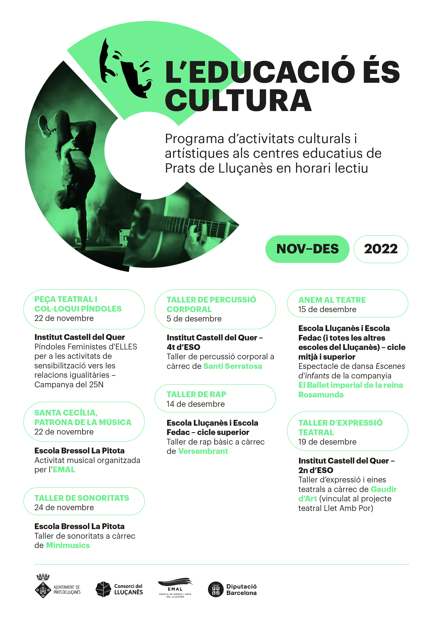 L’Ajuntament de Prats de Lluçanès organitza amb el suport de la Diputació i entitats locals, un programa anomenat ‘L’educació és cultura’, per acostar la cultura i les arts, en forma de tallers, activitats i espectacles als centres educatius en horari lectiu.