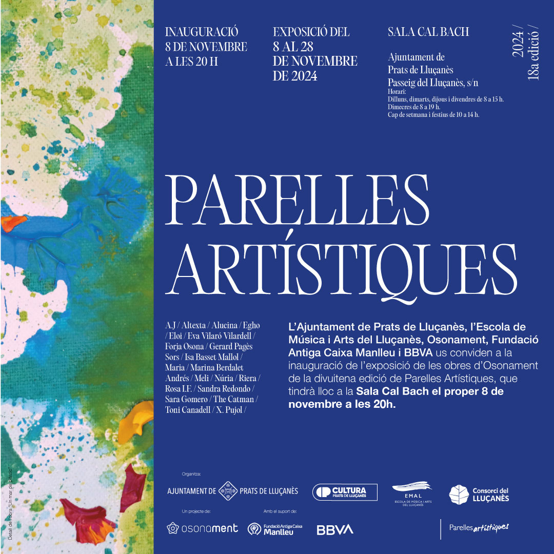 Les obres de la 18a edició d’Osona del projecte Parelles Artístiques s’exposaran properament a la Sala Cal Bach de l’Ajuntament de Prats de Lluçanès. L’acte d’inauguració tindrà lloc divendres 8 de novembre a les 20h i comptarà amb el relat de l’experiència d’una de les parelles artístiques que hi han participat, formada per l’Ester Barnils i la Sara Gamero.