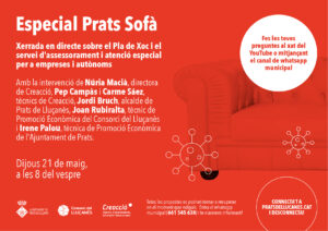 Aquest dijous 21 de maig, a les 8 del vespre, s’emetrà una sessió especial de Prats Sofà per exposar el Pla de Xoc econòmic i el servei d’assessorament i atenció per a empreses i autònoms que s’ha impulsat des de Creacció, l’Agència d’Emprenedoria, Innovació i Coneixement d’Osona. A més es donarà a conèixer l’assessorament que dona el Consorci del Lluçanès i els ajuts que ofereix l’Ajuntament de Prats de Lluçanès.