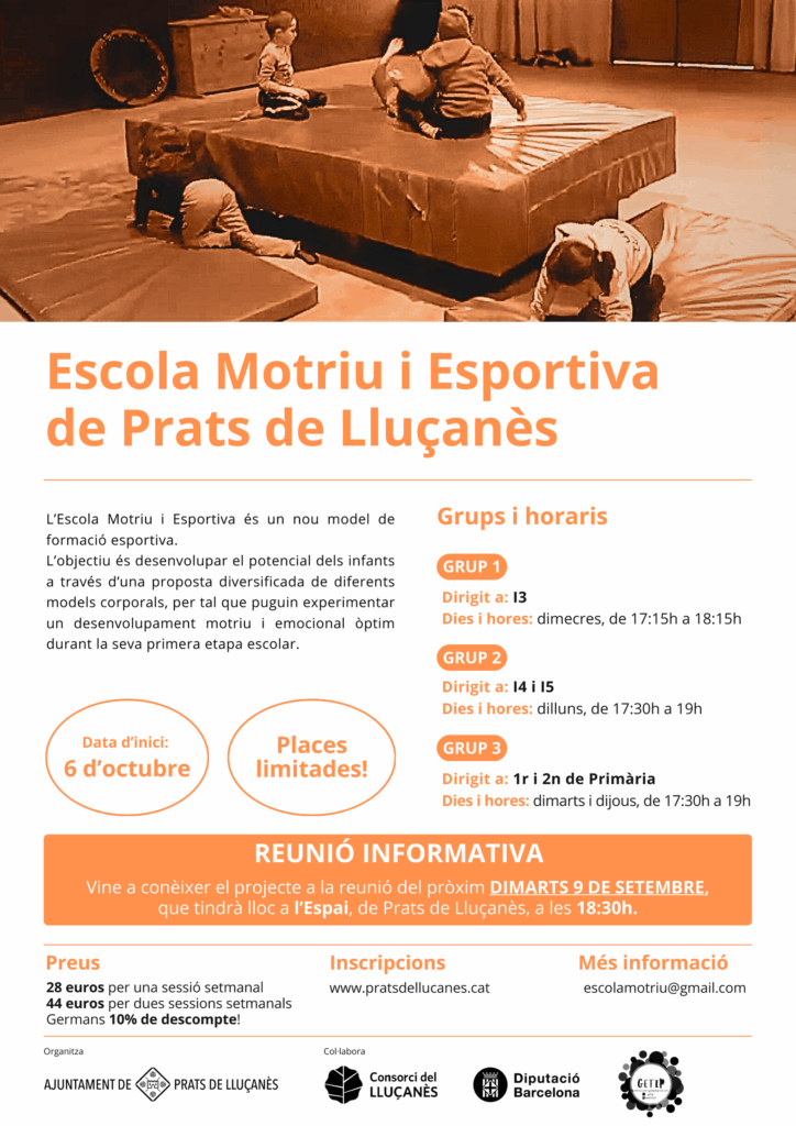 L’Escola Motriu i Esportiva de Prats de Lluçanès inicia un nou curs el pròxim 6 d’octubre, amb l’objectiu de desenvolupar el potencial dels infants a través d’una proposta diversificada de diferents models corporals per tal que puguin experimentar un desenvolupament motriu i emocional òptim durant la seva primera etapa escolar. El programa consta de tres grups, des d’I3 fins a 2n de Primària.