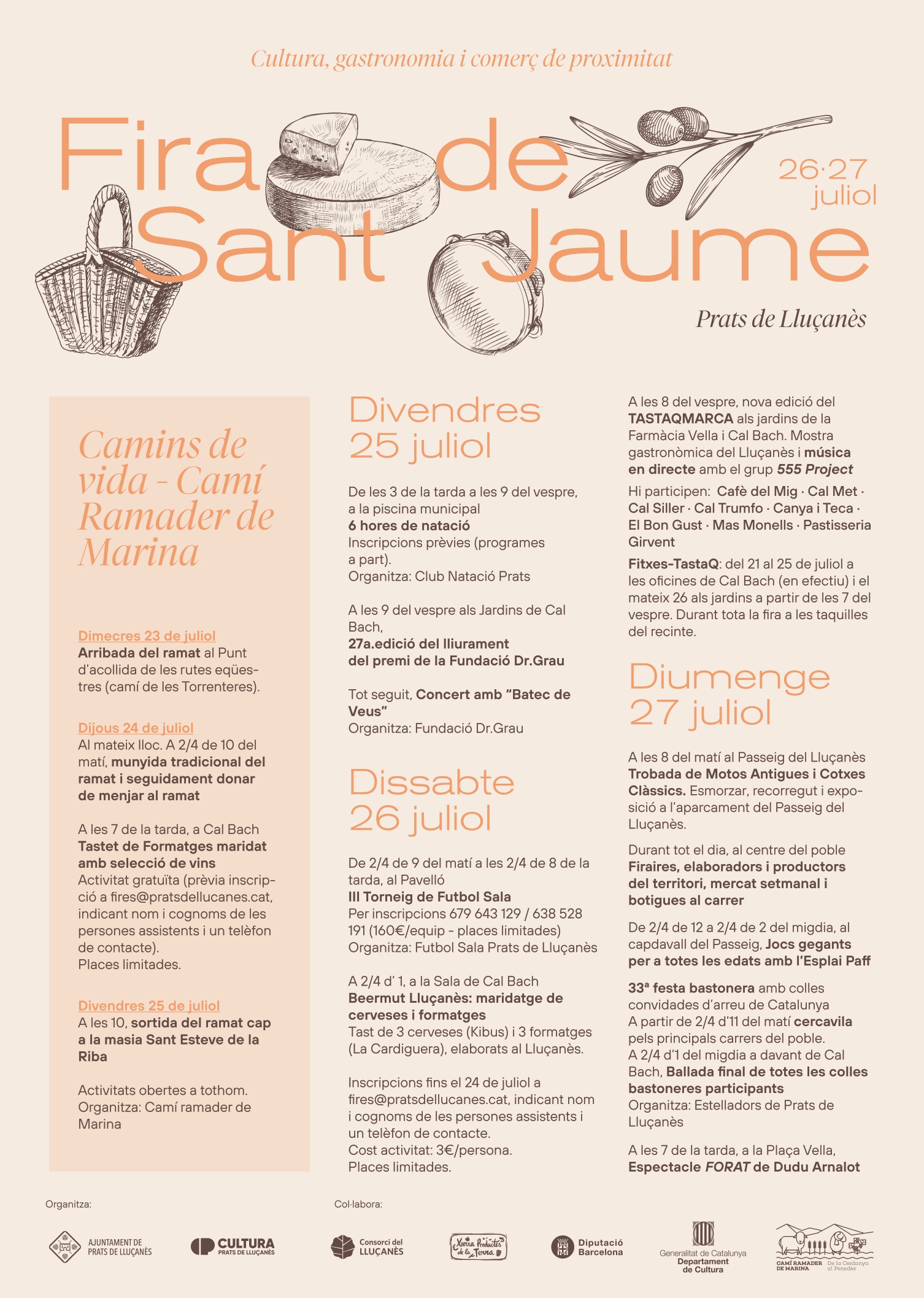 Amb una proposta que combina patrimoni, cultura popular, gastronomia de proximitat, música i esport, la Fira de Sant Jaume d’aquest 2025 començarà amb protagonisme pel Camí Ramader de Marina, una ruta històrica de transhumància que arribarà al poble el dimecres 23 de juliol, pel camí de les Torrenteres.