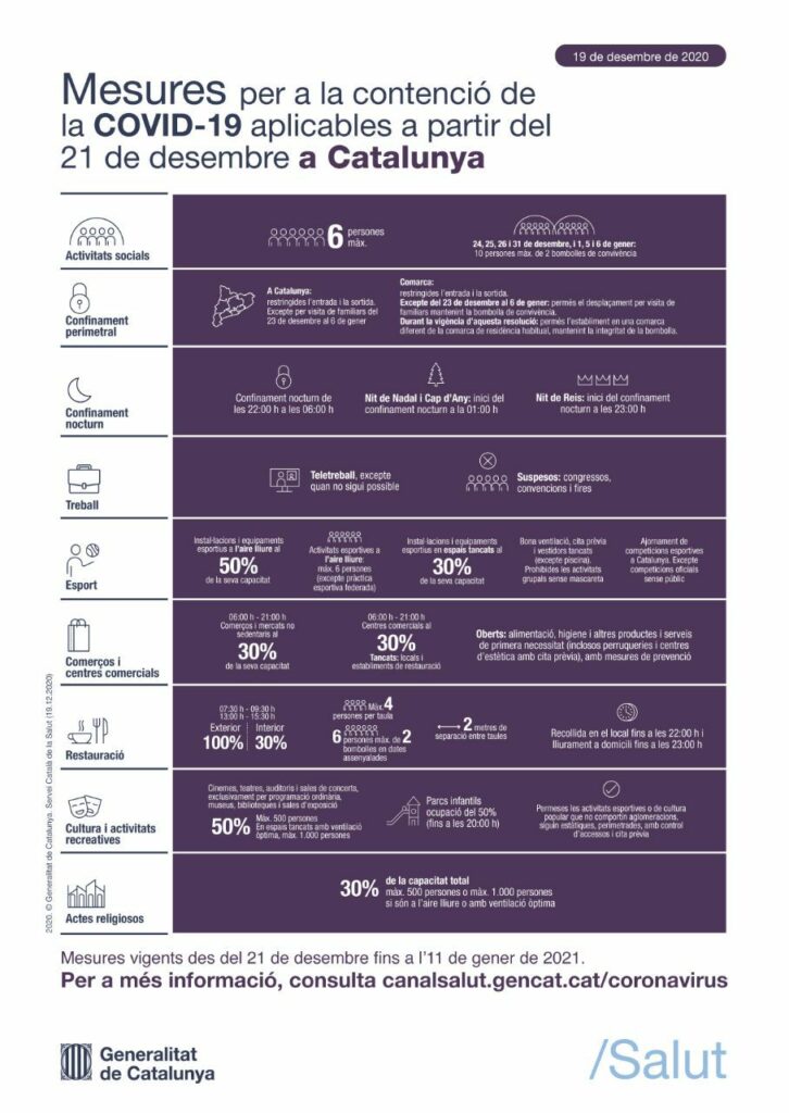 El Goven de la Generalitat ha aprovat noves mesures davant l’empitjorament de les dades epidemiològiques. Els canvis estaran en vigor dilluns vinent, 21 de desembre i fins l’11 de gener, però hi haurà excepcions els dies festius.