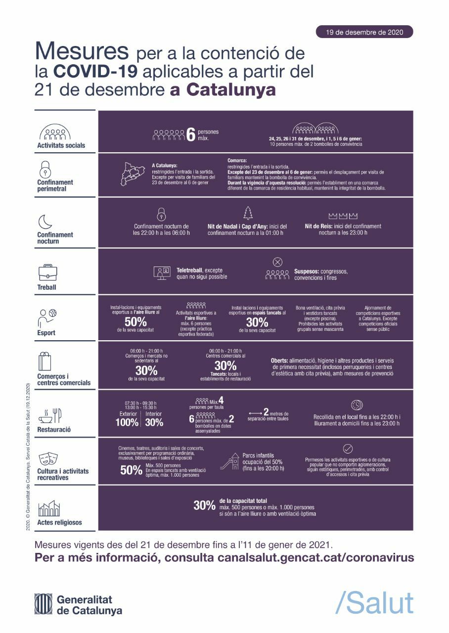 El Goven de la Generalitat ha aprovat noves mesures davant l’empitjorament de les dades epidemiològiques. Els canvis estaran en vigor dilluns vinent, 21 de desembre i fins l’11 de gener, però hi haurà excepcions els dies festius.