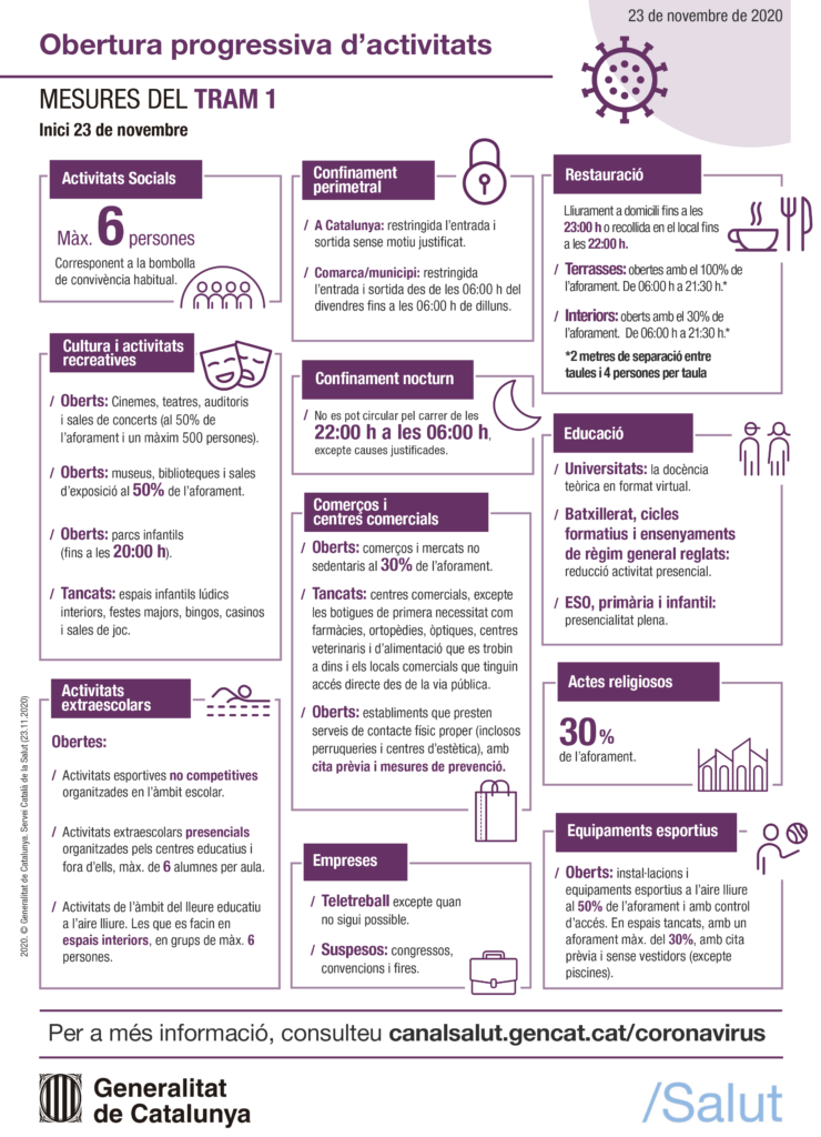 La Generalitat ha presentat el pla de reobertura que començarà dilluns vinent, 23 de novembre. Consta de quatre trams de relaxació de les restriccions. El procés, si la situació epidemiològica ho permet, durarà dos mesos i les mesures s’avaluaran cada quinze dies.
