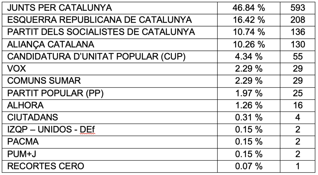 En segona posició, s’hi situa Esquerra Republicana de Catalunya (ERC), que ha rebut un total de 208 vots (16,42%).