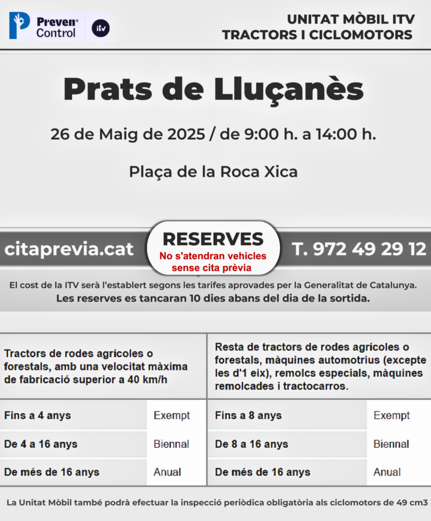 El pròxim dilluns, 26 de maig de 2025, Prats de Lluçanès rebrà la visita de la unitat mòbil d’ITV per a tractors, maquinària agrícola i ciclomotors.