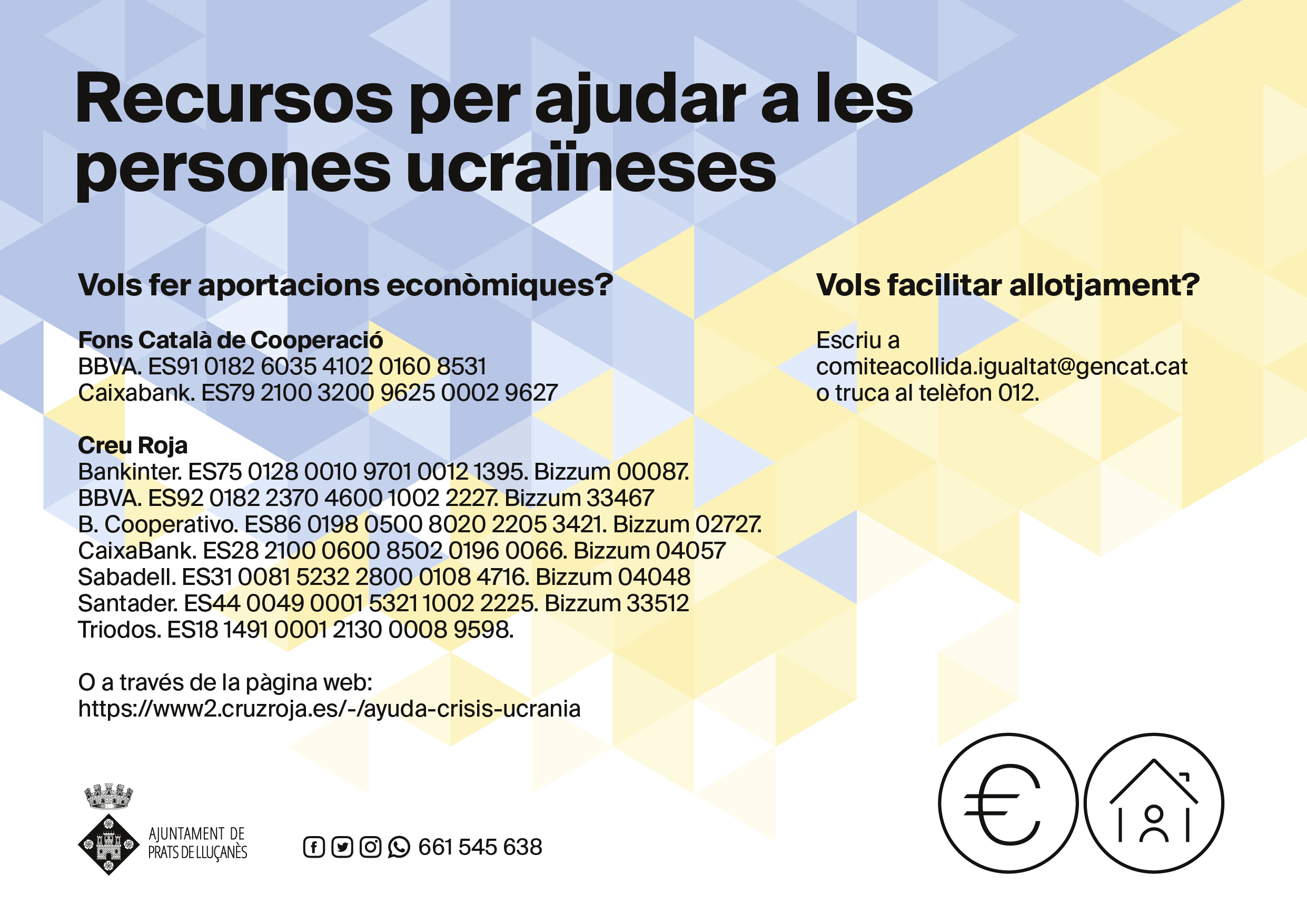 Des del Departament d’Igualtat, Migracions i Ciutadania es treballa per facilitar l’allotjament de persones d’Ucraïna que ja siguin aquí o hagin d’arribar en les propoeres setmanes. Les persones que hi vulguin col·laborar poden posar-s’hi en contacte al correu electrònic comiteacollida.igualtat@gencat.cat o al telèfon 012.