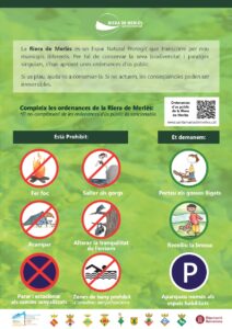 Us informem que el bany a la riera de Merlès entre Sant Cristòfol i el Pont de les Heures, queda prohibit fins al 15 de setembre. A més, es prohibeix fer foc, saltar als gorgs, acampar, alterar la tranquil·litat de l’entorn, parar o estacionar als camins senyalitzats, molestar o capturar la fauna, malmetre la vegetació, alliberar fauna salvatge o animals de companyia i tirar pedres a la riera o actuar de manera que puguis molestar la fauna de l’entorn. D’altra banda, es demana portar els gossos lligats, recollir la brossa i aparcar només en espais habilitats.