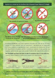 A la Riera de Merlès hi ha dues espècies invasores de cranc de riu: el cranc senyal i el cranc vermell, tots dos americans i introduïts per les persones. Els crancs invasors es reprodueixen molt i destrossen els nostres rius, ja que són depredadors de peixos, amfibis, invertebrats i plantes. A més, porten una malaltia, l’afanomicosis, que està causant l’extinció del cranc de riu autòcton. No traslladis cap tipus de cranc ni dins la mateixa riera ni a un altre riu. Capturar fauna invasora o autòctona i moure-la és sancionable.