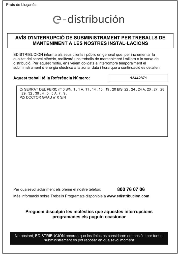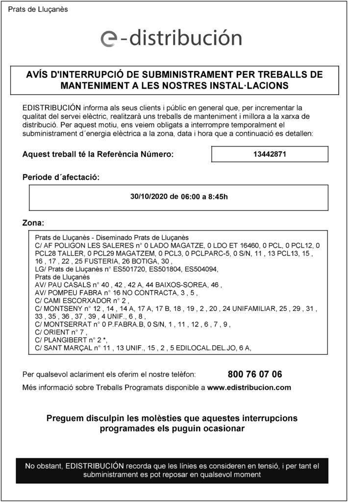 L’Empresa Edistribución comunica que aquest divendres 30 d’octubre es produirà un tall en el subministrament elèctric entre les 6 i ¾ de 9 del matí per treballs de reparació i manteniment a la xarxa.