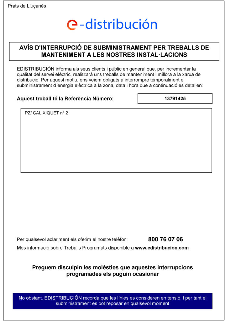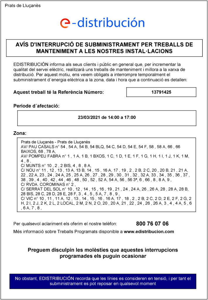 L’Empresa Edistribución comunica que el proper dimarts 23 de març es produirà un tall en el subministrament elèctric entre les 2 del migdia i les 5 de la tarda per treballs de reparació i manteniment a la xarxa.