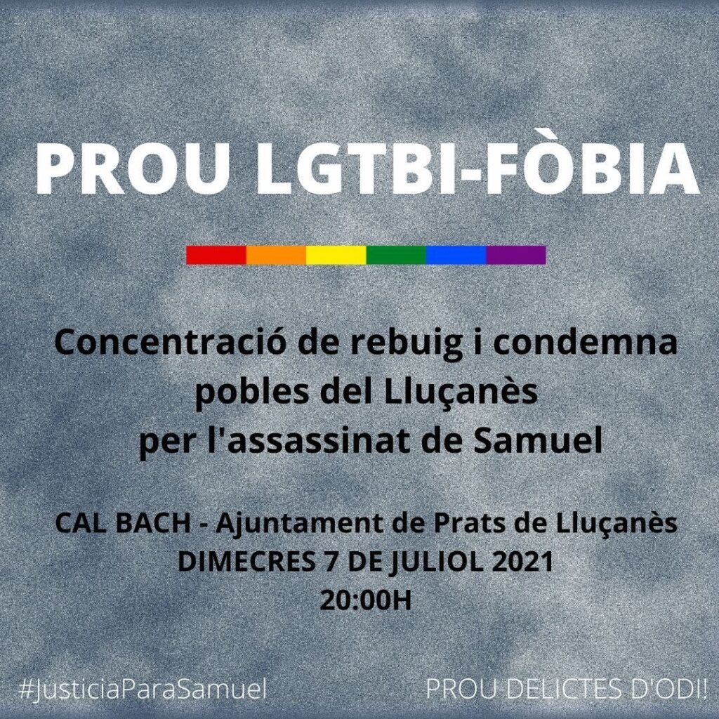 En relació amb l’homicidi homòfob de Samuel i els fets ocasionats els darrers dies sobre la violència homofòbica, l’Assossiació Talcomsom amb el suport del SAI LGTBI Osona i l’Ajuntament de Prats convoca una concentració de rebuig i condemna de qualsevol acte LGTBI-fòbic.