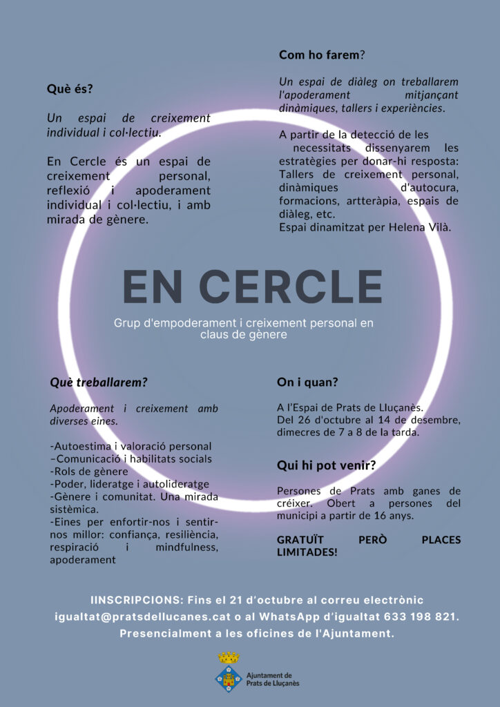 Les places són limitades. Cal inscripció prèvia abans del 14 de novembre al correu igualtat@historic.pratsdellucanes.cat, al whatsapp d’igualtat 633 198 821 o en persona a les oficines de l’ajuntament.