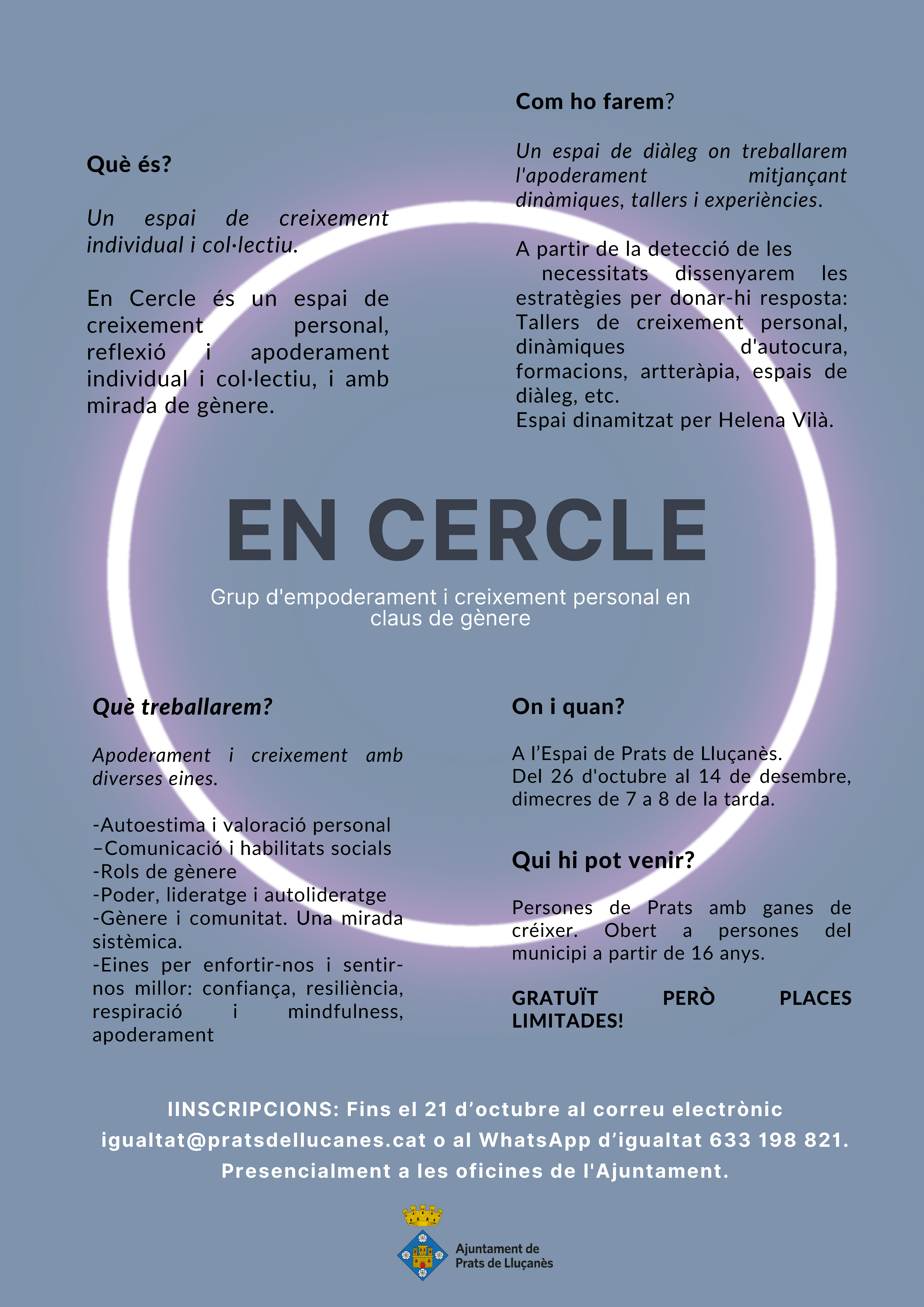 Les places són limitades. Cal inscripció prèvia abans del 14 de novembre al correu igualtat@historic.pratsdellucanes.cat, al whatsapp d’igualtat 633 198 821 o en persona a les oficines de l’ajuntament.