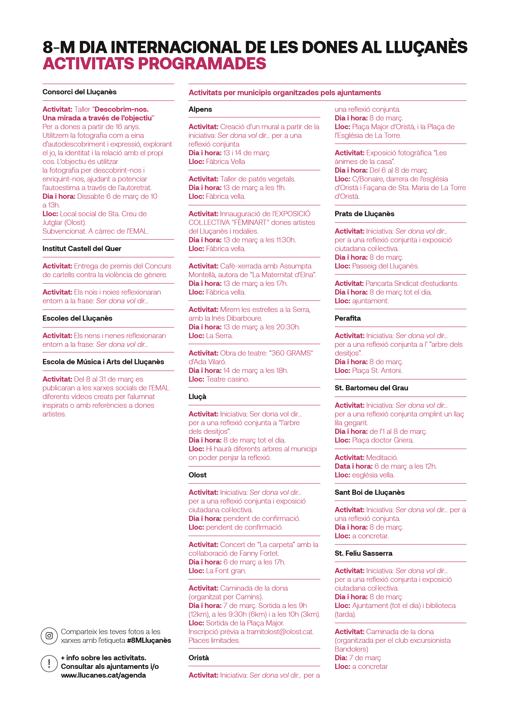 La programació d’enguany ha estat promoguda per la Taula d’Igualtat i, posteriorment, treballada conjuntament amb tots els ajuntaments del Lluçanès i el Consorci del Lluçanès i la podeu consultar aquí.