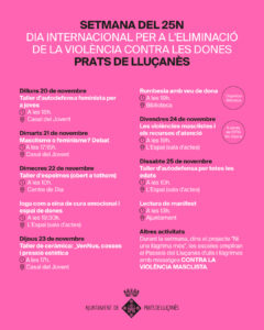 El programa començarà dilluns 20 de novembre, amb el taller d’autodefensa feminista per a joves, que es farà a les 6 de la tarda al Casal del Jovent. El dimarts 21 de novembre, a 1/4 de 6 de la tarda, al mateix espai, es durà a terme el debat “Masclisme o feminisme?”.