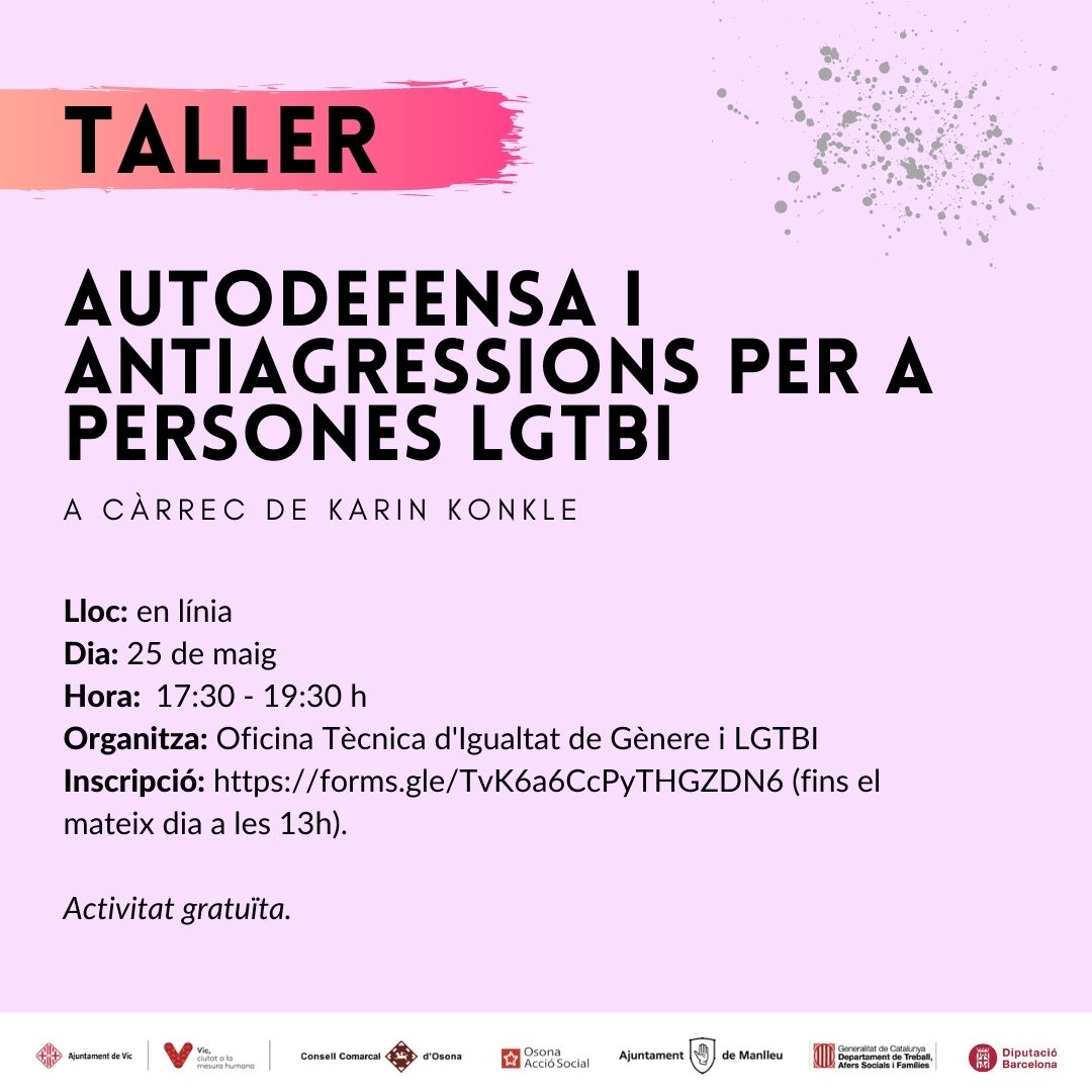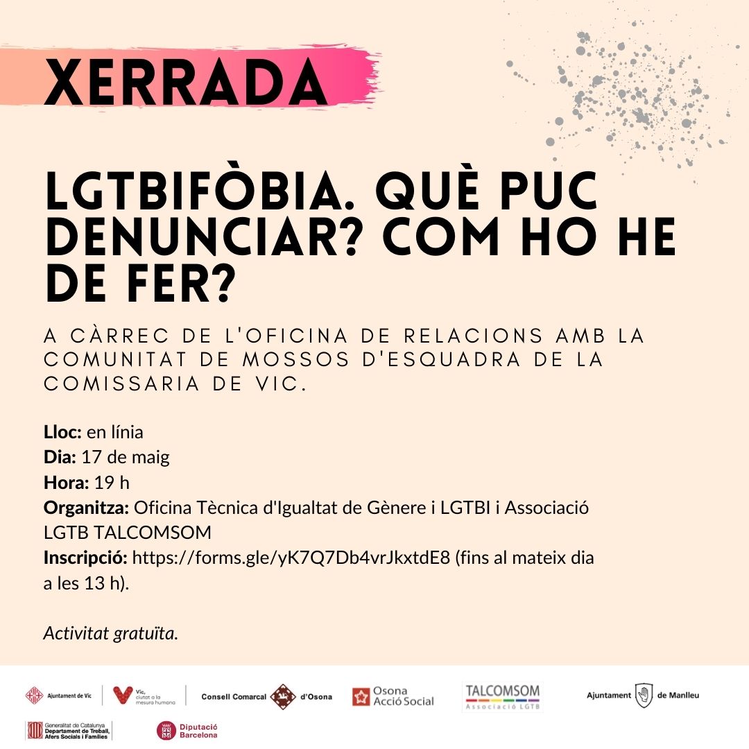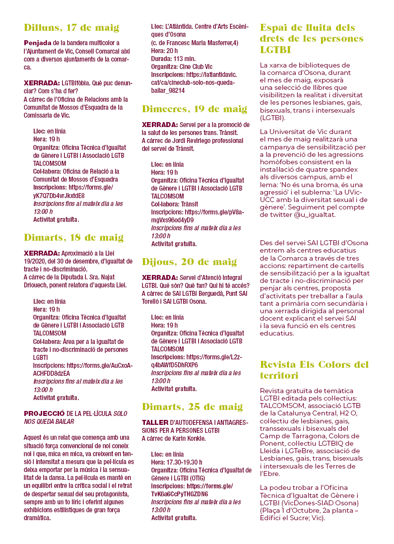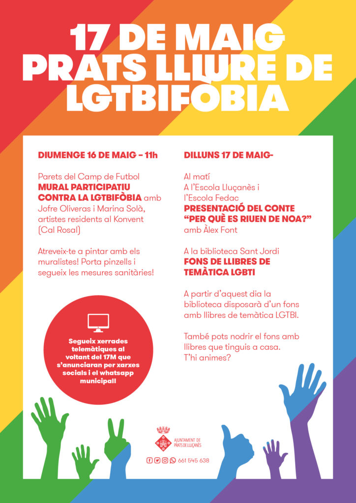 L’Oficina Tècnica d’Igualtat de gènere i LGTBI del Consell Comarcal d’Osona organitza xerrades telemàtiques i un taller amb motiu del 17 de maig. Podeu consultar totes les xerrades previstes aquí.