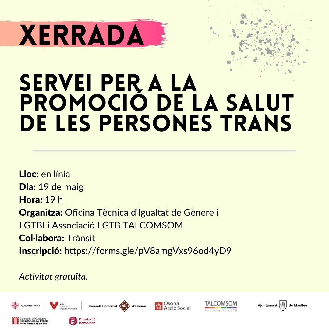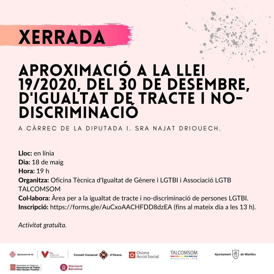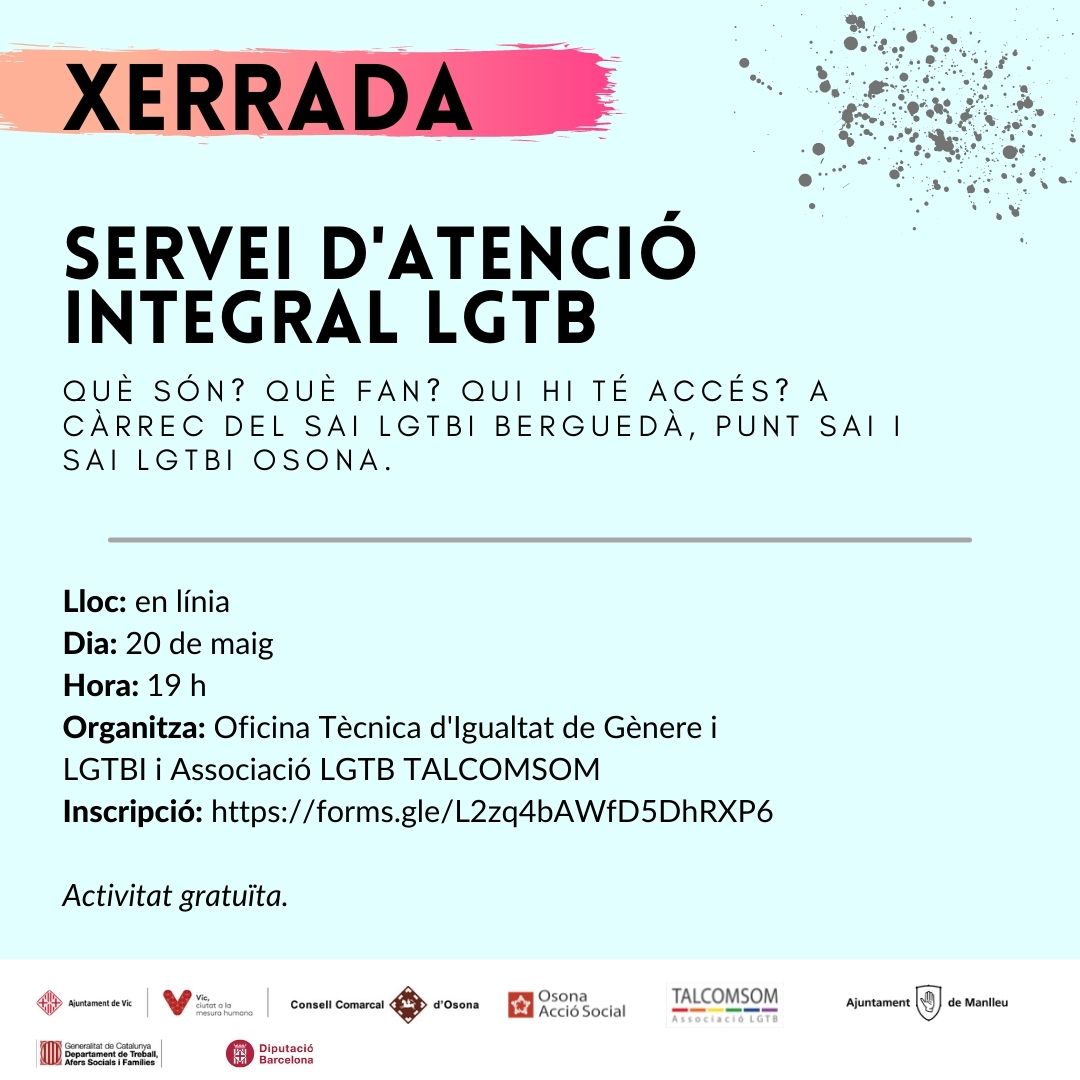 L’Oficina Tècnica d’Igualtat de gènere i LGTBI del Consell Comarcal d’Osona organitza xerrades telemàtiques i un taller amb motiu del 17 de maig. Podeu consultar totes les xerrades previstes aquí.