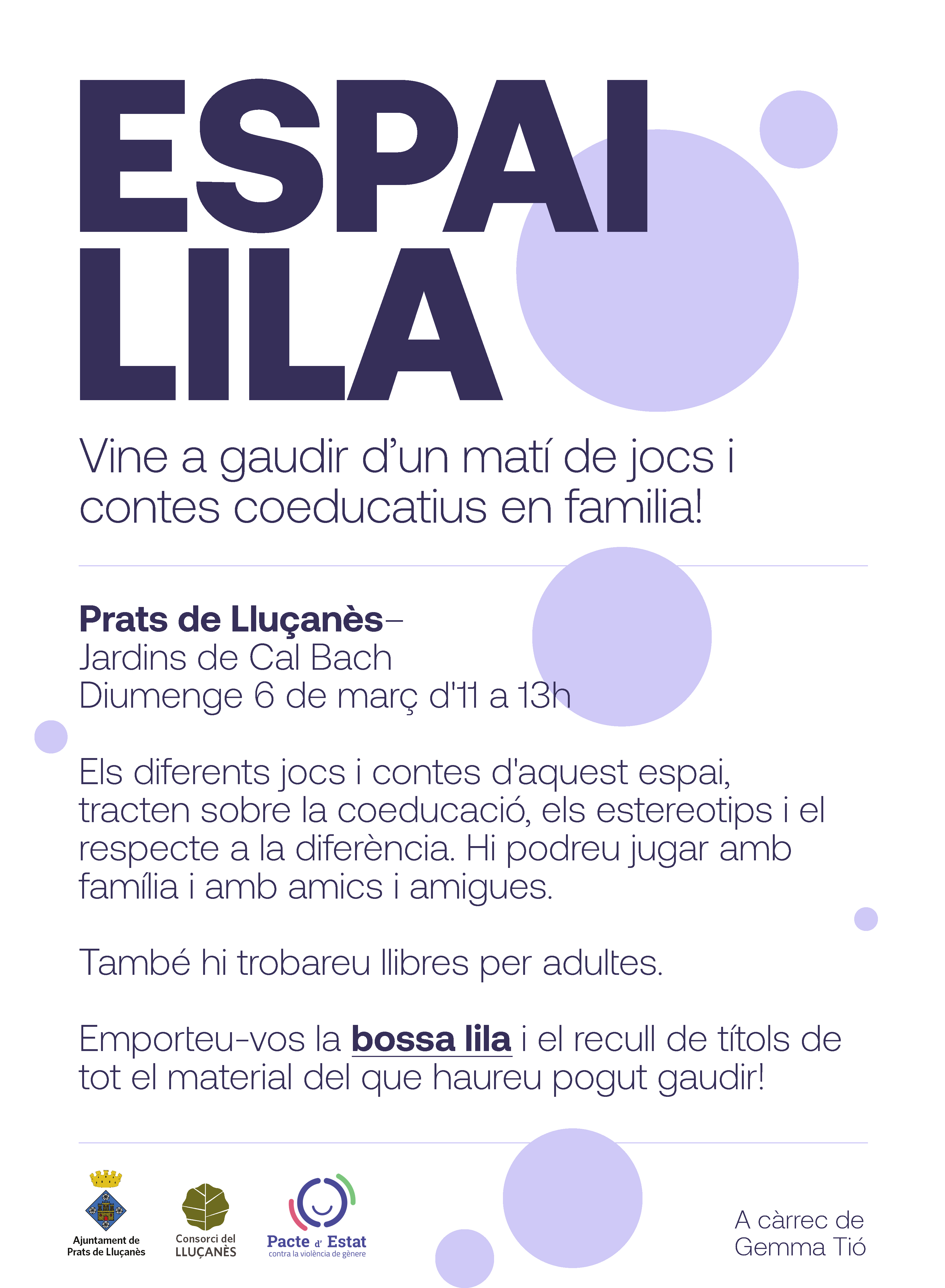 Una de les novetats que se suma a la programació d’enguany és l’Espai lila que s’organitzarà als Jardins de Cal Bach d’11 a 1 del matí amb contes, jocs i llibres coeducatius per jugar i aprendre amb família. L’activitat anirà dirigida a càrrec de Gemma Tió.