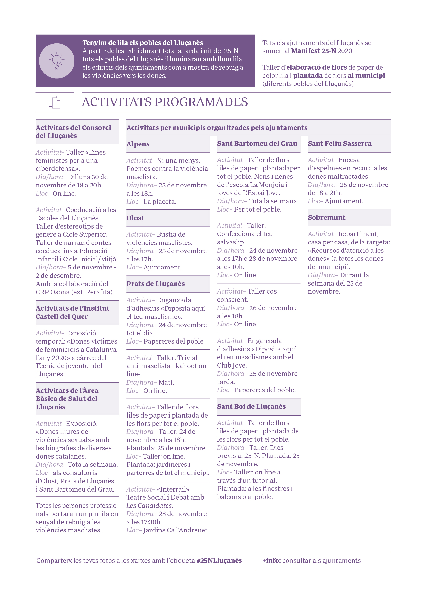 Coincidint amb el mateix dia 25 de novembre, se celebrarà la plantada de flors liles a les jardineres i parterres del municipi, així com la lectura del manifest davant de Cal Bach a les 12 del migdia, seguit d’un minut de silenci en senyal de suport a les dones que travessen situacions de violència masclista.