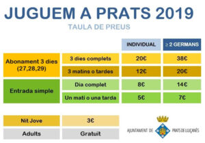 Els propers 27, 28 i 29 de desembre arriba la 19a edició del Juguem a Prats, el saló de joc i entreteniment per a la quitxalla del municipi i la resta de la comarca de 9 del matí a 1 del migdia i de 4 de la tarda a 8 del vespre. Enguany, i com a novetat destacada, els preus s’abaixen un 15% respecte les anteriors edicions, on se’n beneficiaran especialment les famílies amb més dos o més germans que adquireixin l’abonament. Tant les entrades simples com els abonaments es podran adquirir al Pavelló, els mateixos dies de l’activitat.